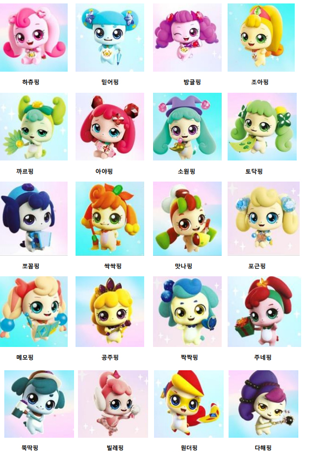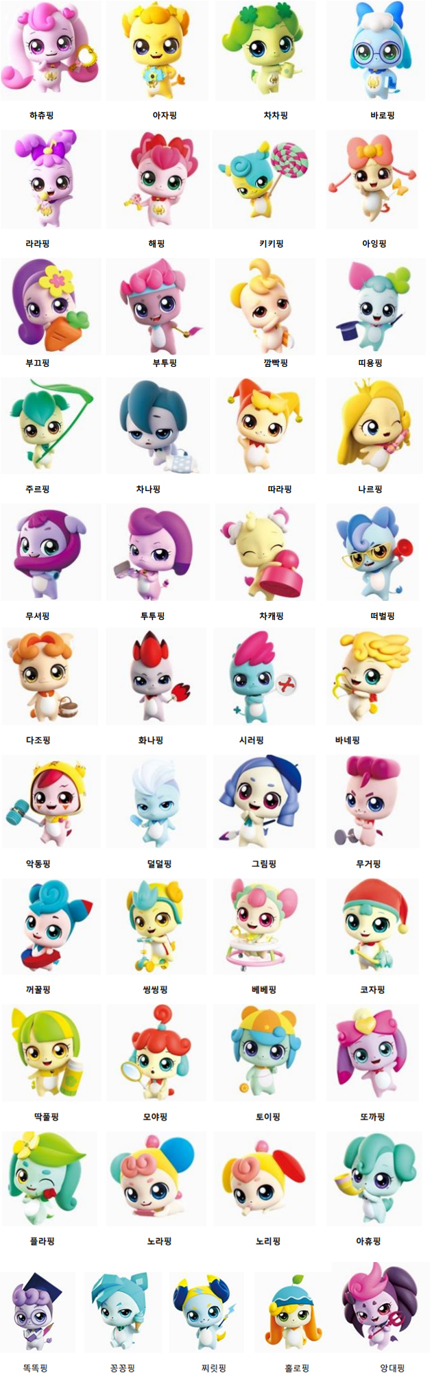 하츄핑, 바로핑, 아자핑, 차차핑, 라라핑, 해핑, 다이아 하츄핑, 조아핑, 방글핑, 믿어핑, 플로라 하츄핑, 꾸래핑, 나나핑, 솔찌핑, 베리 하츄핑, 샤샤핑, 포실핑, 말랑핑