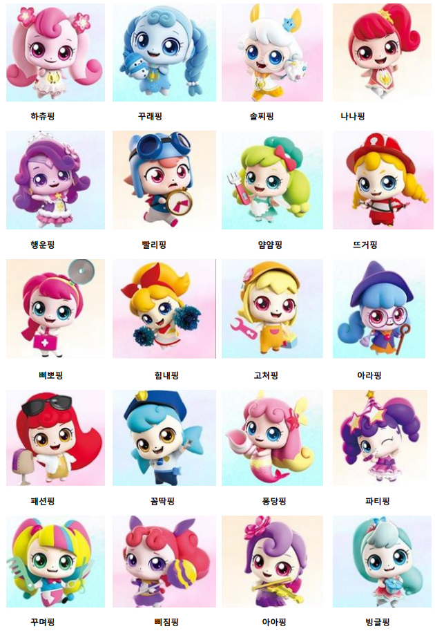 까르핑, 아야핑, 소원핑, 토닥핑, 쪼꼼핑, 싹싹핑, 맛나핑, 포근핑, 메모핑, 공쥬핑, 짝짝핑, 주네핑, 뚝딱핑, 발레핑, 원더핑