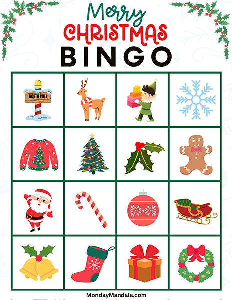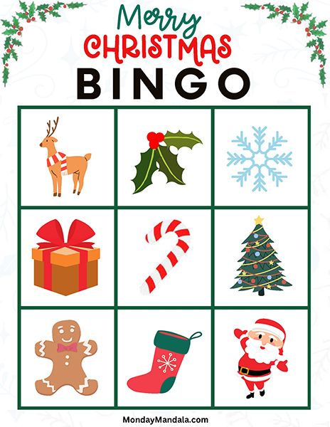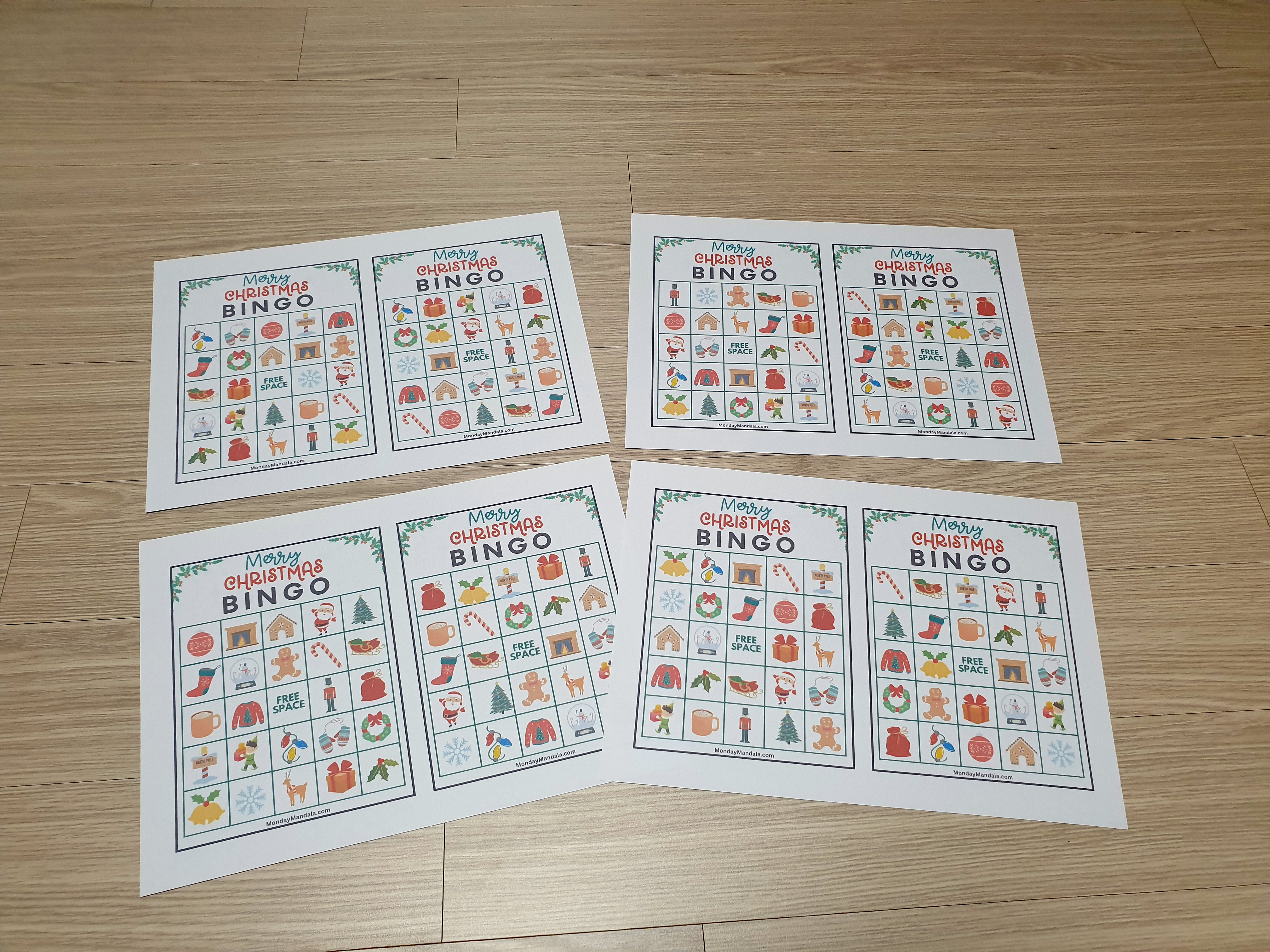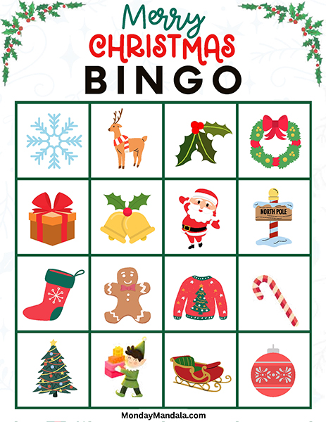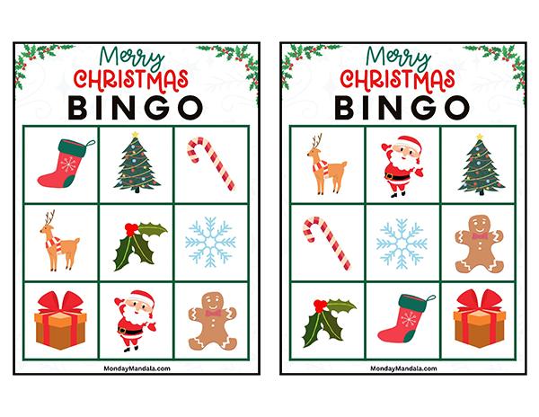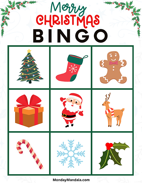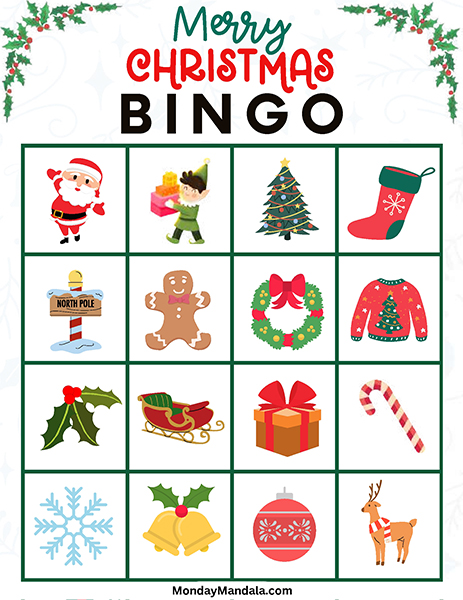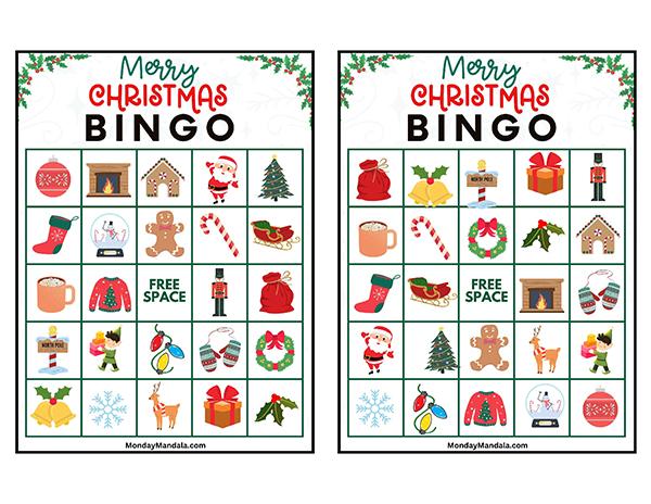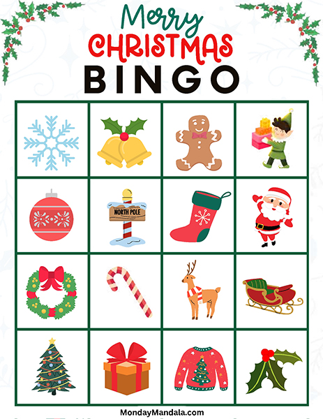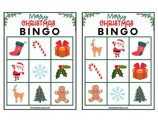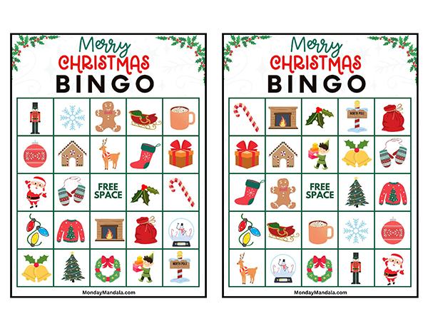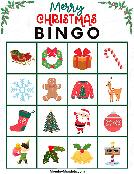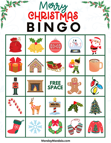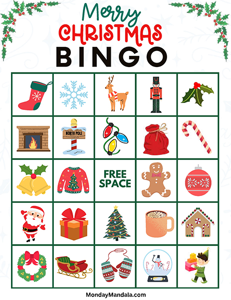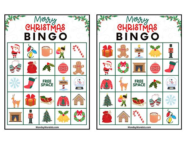 올해는 특별한 크리스마스 빙고게임으로 가족과 친구들과 함께 즐거운 시간을 보내보세요! 생강빵, 산타클로스, 루돌프, 썰매, 종, 눈송이, 사탕막대, 싼타양말, 장갑, 호두깍기인형, 화로, 그리고 방울 등 다양한 크리스마스 그림으로 가득한 이 빙고게임은 여러분에게 환상적인 크리스마스 분위기를 선사할 것입니다!