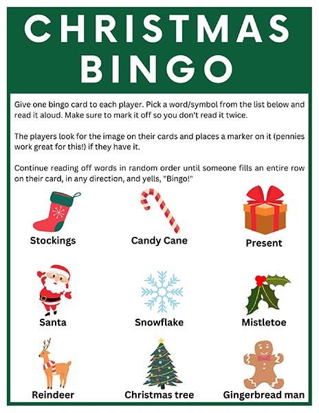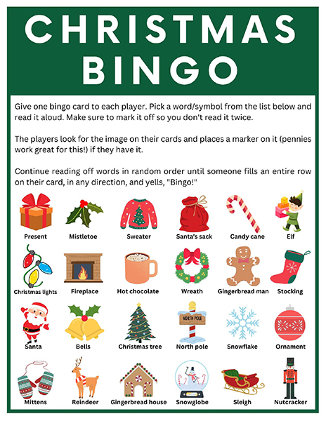 이 크리스마스 빙고게임은 3x3, 4x4, 5x5 크기의 빙고판으로 이루어져 있습니다. 생강빵, 산타클로스, 루돌프, 썰매, 종, 눈송이, 사탕막대, 싼타양말, 장갑, 호두깍기인형, 화로, 그리고 방울 등 다양한 크리스마스 관련 그림들이 빙고판에 랜덤하게 배치되어 있습니다. 가로, 세로, 대각선 중 먼저 3줄을 맞추는 분이 이기는 게임입니다.