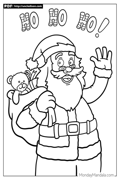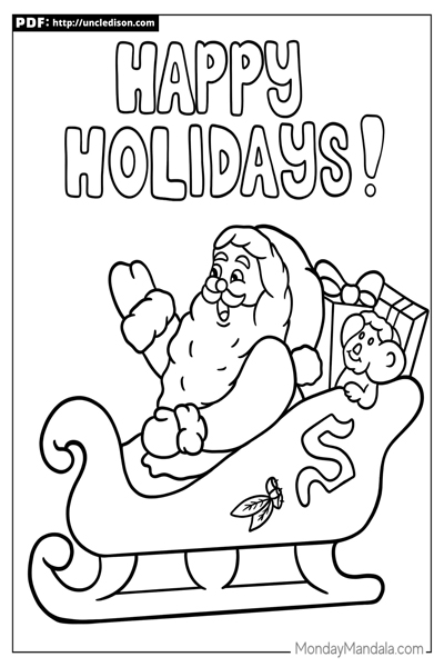 산타클로스의 익살스러운 썰매 타기: 산타클로스가 익살스럽게 썰매를 타며 눈을 피하는 도안으로, 아이들은 신나고 재미있는 순간을 상상하여 도안을 색칠할 수 있습니다.