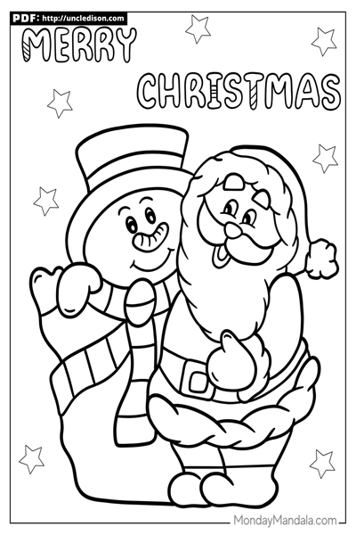산타클로스와 눈사람의 눈덩이 싸움: 눈사람과 산타클로스가 익살스럽게 눈덩이 싸움을 하는 장면을 그린 도안입니다. 아이들은 유쾌한 순간을 상상하며 도안을 완성할 수 있습니다.