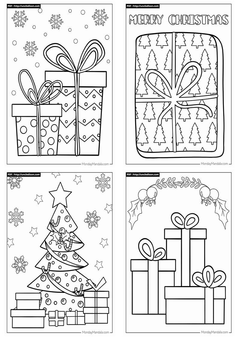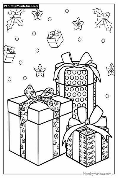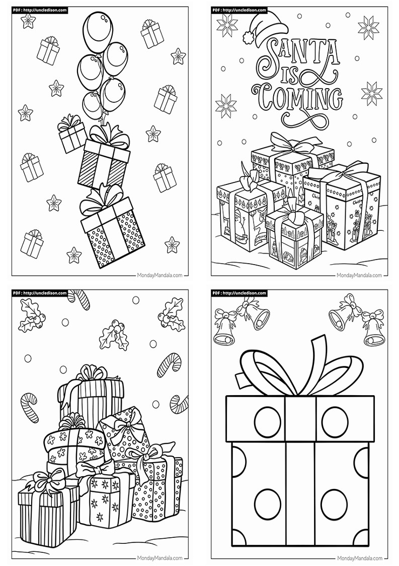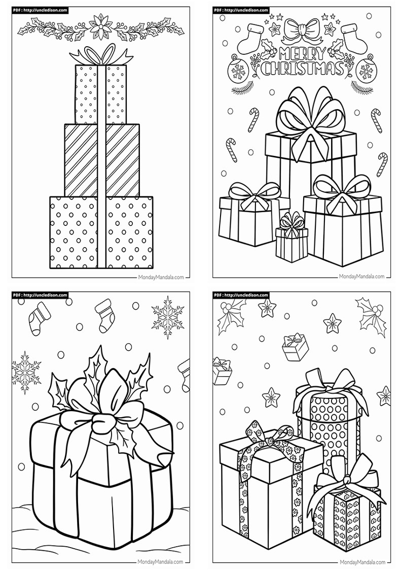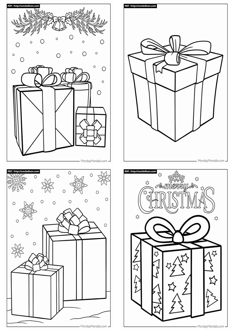 또한, 색칠하는 과정에서 손과 색감 감각을 발달시킬 수 있어 유아의 발달에도 도움이 될 것입니다. 선물박스는 크리스마스에 선물을 담아주는 중요한 요소입니다. 이 색칠도안들은 다양한 크기와 모양의 선물박스를 그려놓았습니다. 유아들은 선물박스에 원하는 색깔과 패턴을 입혀서, 자신만의 특별한 선물을 상상하며 색칠할 수 있습니다.