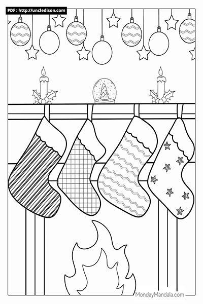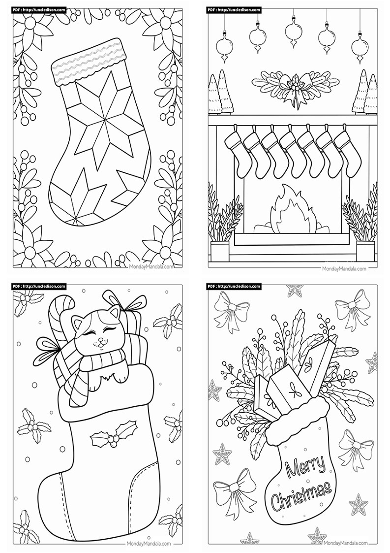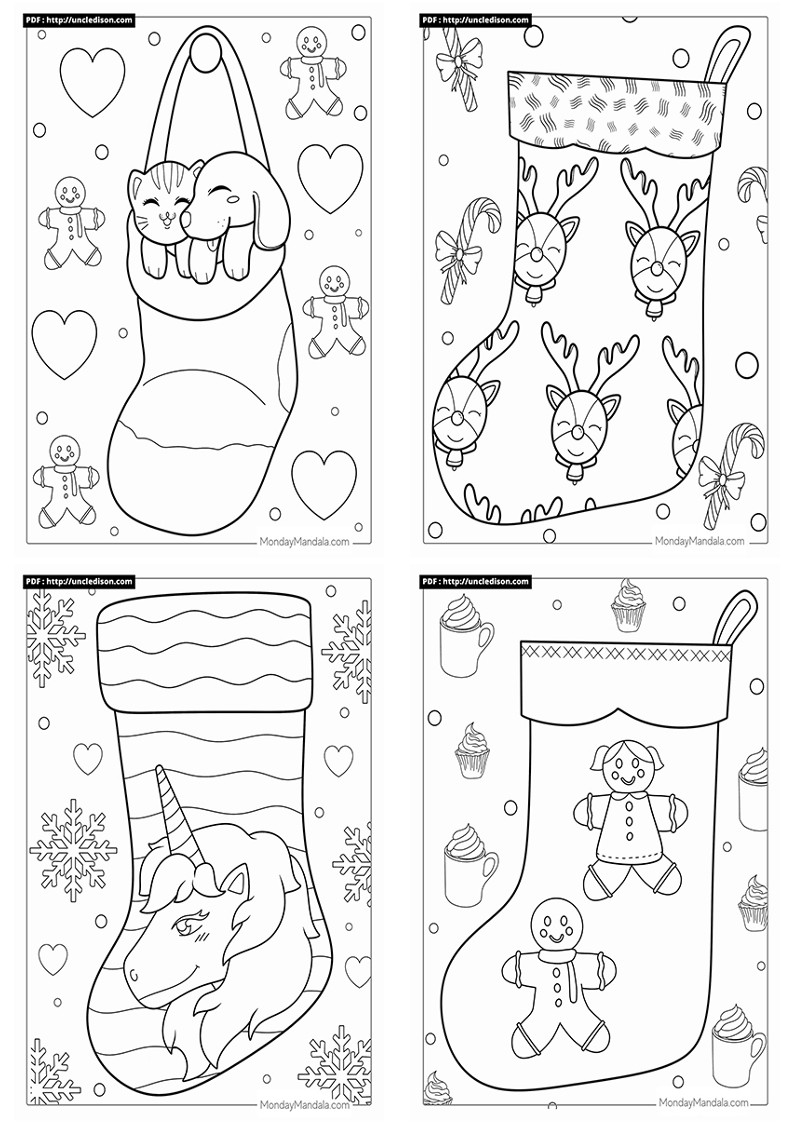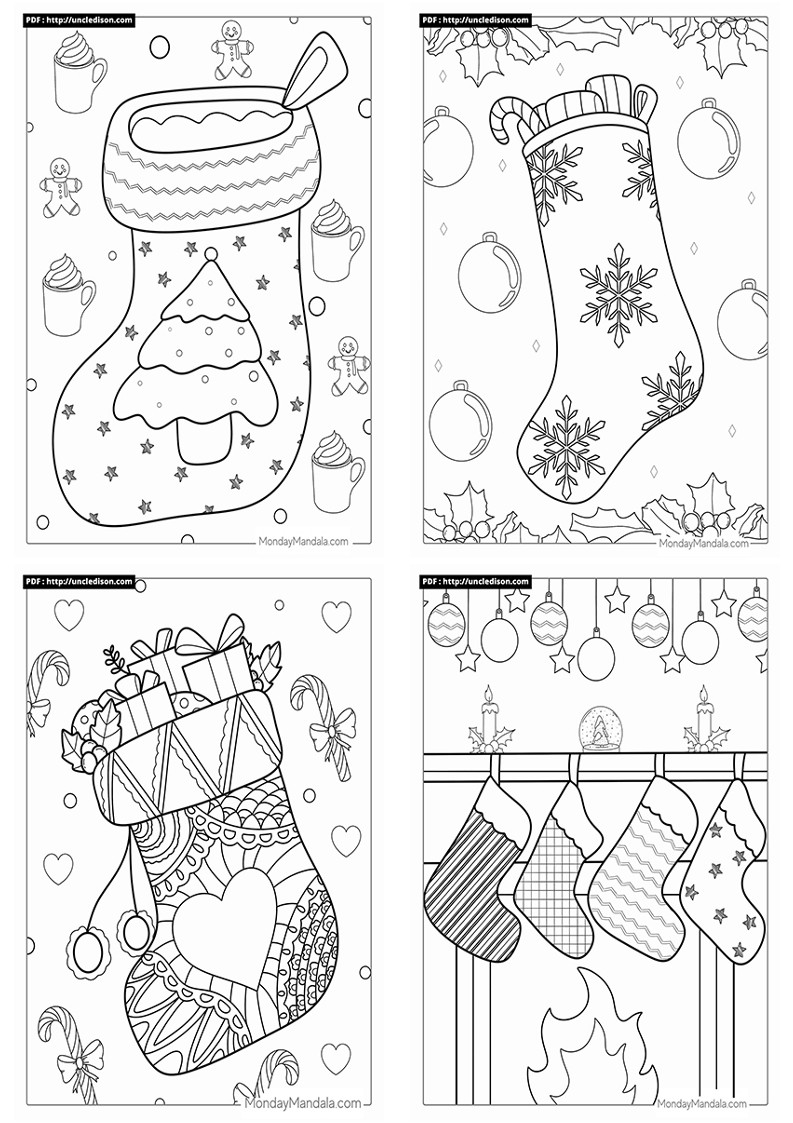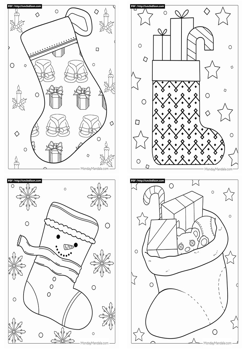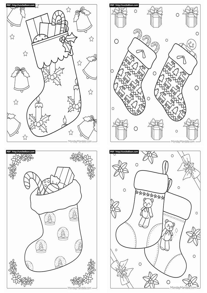 선물양말은 크리스마스 트리나 벽에 걸어놓는 전통적인 장식품입니다. 이 색칠도안들은 다양한 디자인의 선물양말을 그려놓았습니다. 유아들은 자신만의 창의력으로 선물양말을 색칠하면서, 크리스마스 선물들을 기다리는 설레임을 더욱 높일 수 있습니다.