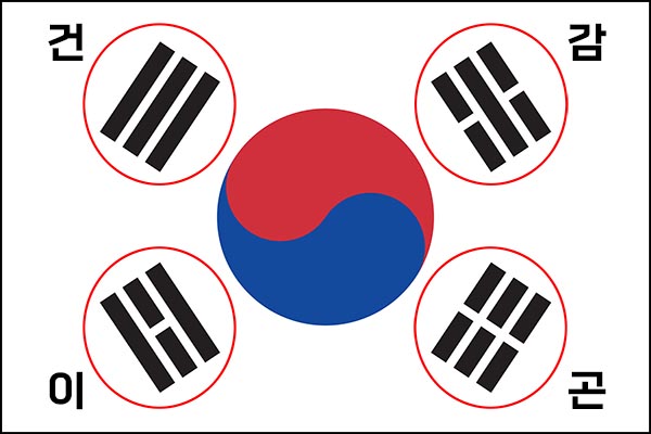 네 귀퉁이에는 팔괘 중 상하가 대칭되는 사괘인 건(乾, ☰), 곤(坤, ☷), 감(坎, ☵), 리(離, ☲)를 그렸습니다. 건괘는 하늘, 곤괘는 땅, 감괘는 물 이괘는 불을 상징합니다.( Each trigram represents heaven, earth, fire, and the water.)