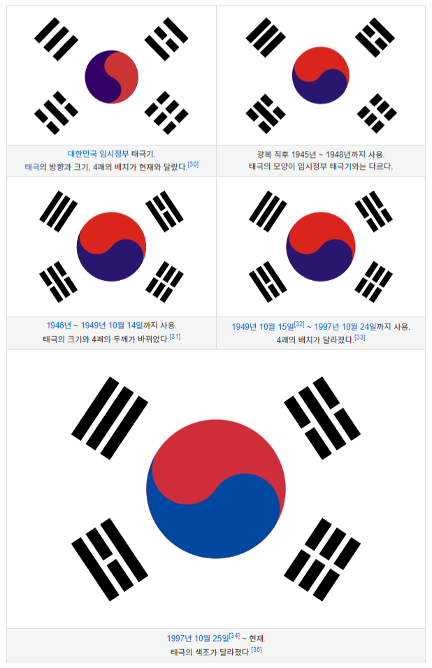 1997년 이전에는 연한 빨강 - 진한 파랑과 진한 빨강 - 연한 파랑이 같이 사용되었다. 1978년 12월 박정희 대통령의 9대 대통령 취임을 다룬 대한뉴스의 영상을 보면, 취임식장의 태극기는 연한 파랑을 쓰지만 7분 41초에 나온 청와대에 게양된 태극기는 진한 파랑을 쓰는 등 통일되어 있지 않는 모습입니다. 하지만 현재도 총무처고시 공식 색상 이외의 진한 파랑의 태극기가 가끔씩 보이긴 합니다. 대표적인 예로 2022년 문재인 정부의 K9 자주포 이집트 수출 당시 발표회의 태극기. 참고로 오른쪽에 있는 건 이집트의 대통령기입니다. 이 외에 국경일에 거리에 게양하는 태극기나 상품 포장에 그려놓은 태극기에도 진한 파랑 버전이 등장하는 경우가 있습니다. 국경일 게양용은 진한 파랑을 이용하는 추세입니다.