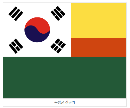 1920년대 독립군들이 사용하던 태극기를 바탕으로 한 군기인 진군기. 태극기의 옆과 아래에 황색, 적색, 녹색 천을 덧대어서 군기로 사용하였습니다. 그 당시 만주에서 활동하던 독립군들은 청산리 전투 같은 무장독립투쟁의 최전선에서도 태극기를 휘날렸습니다.