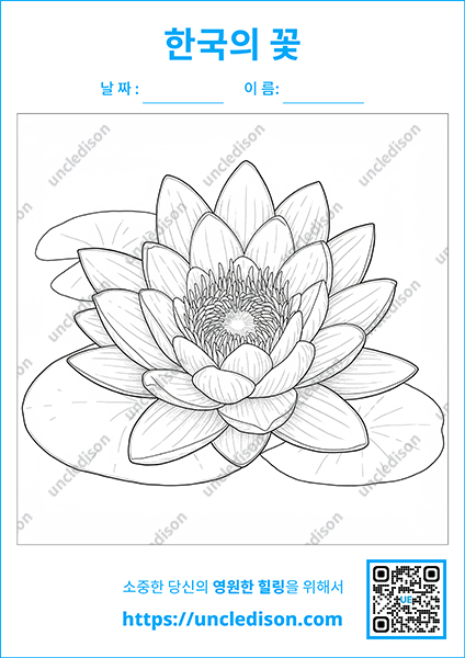 잔잔한 수면 위에 핀 수련은 중심에서 바깥으로 퍼지는 고요한 구조를 가졌어요. 부드럽고 넉넉한 구도로 아이들이 쉽게 색칠할 수 있어요.