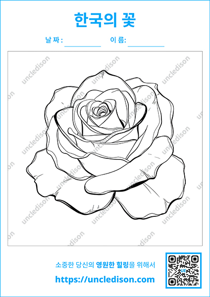 자연스럽게 말린 꽃잎이 돋보이는 장미 도안이에요. 선의 리듬이 마치 전통 붓놀림처럼 표현되어 있어 색칠하며 감상하기 좋아요.