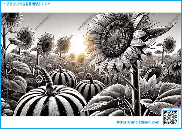 - 해바라기 아래 옹기종기 모여 있는 호박들이 귀여워요