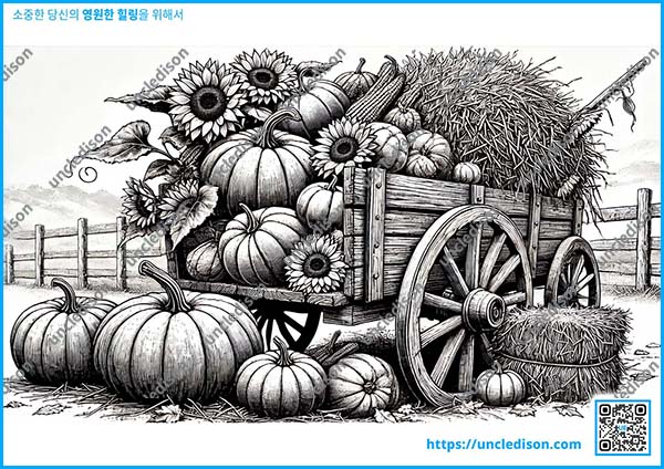 - 높다란 나무 아래 호박과 해바라기, 건초가 가득 실린 나무 수레가 있어요