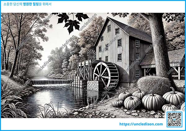- 천천히 돌아가는 커다란 물레방아와 강가의 나무들