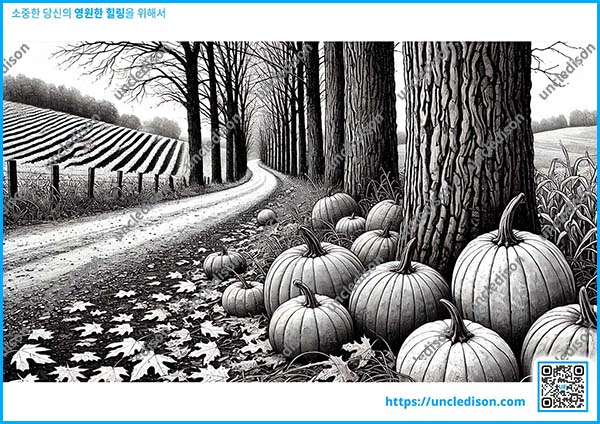 - 길가에 놓인 호박들, 멀리 보이는 헛간에서 피어오르는 연기까지 정겨워요