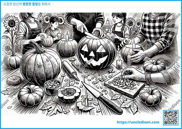 - 테이블에 모여 호박을 조각하는 즐거운 모습