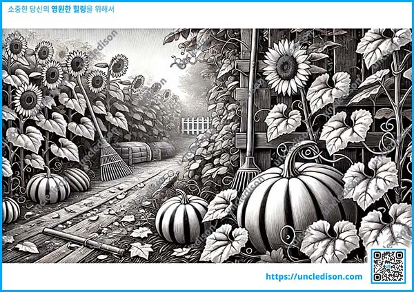 - 덩굴째 자라는 호박들과 키 큰 해바라기들