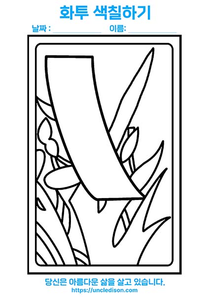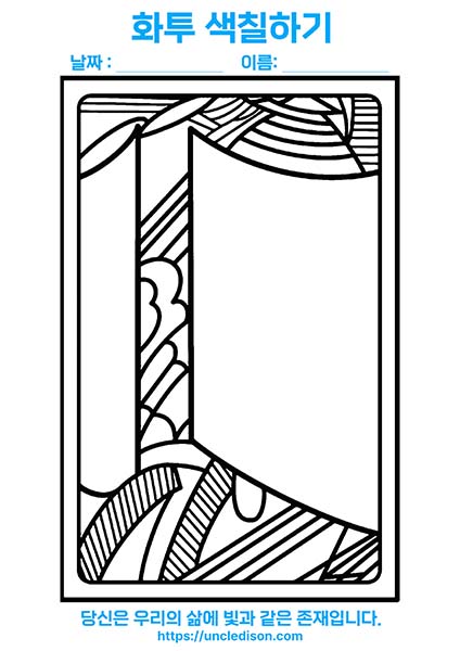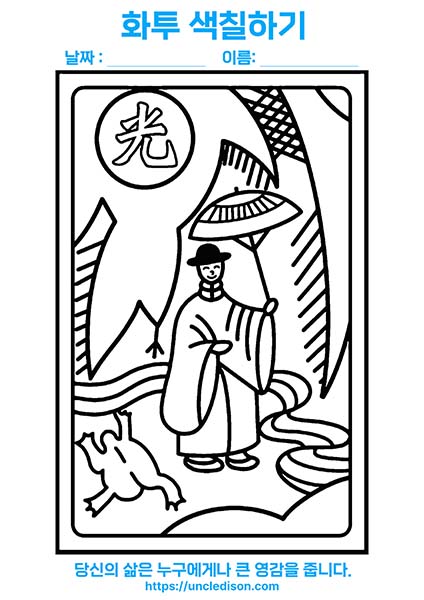 이번의 화투색칠도안에는 48개의 명언이 포함되어 있어서, 색칠을 하는 동안 기분 좋은 느낌을 받으실 수 있습니다. A4용지에 1장의 화투패를 넣어 제작했기 때문에 유아나 어르신들도 쉽게 색칠하실 수 있습니다.