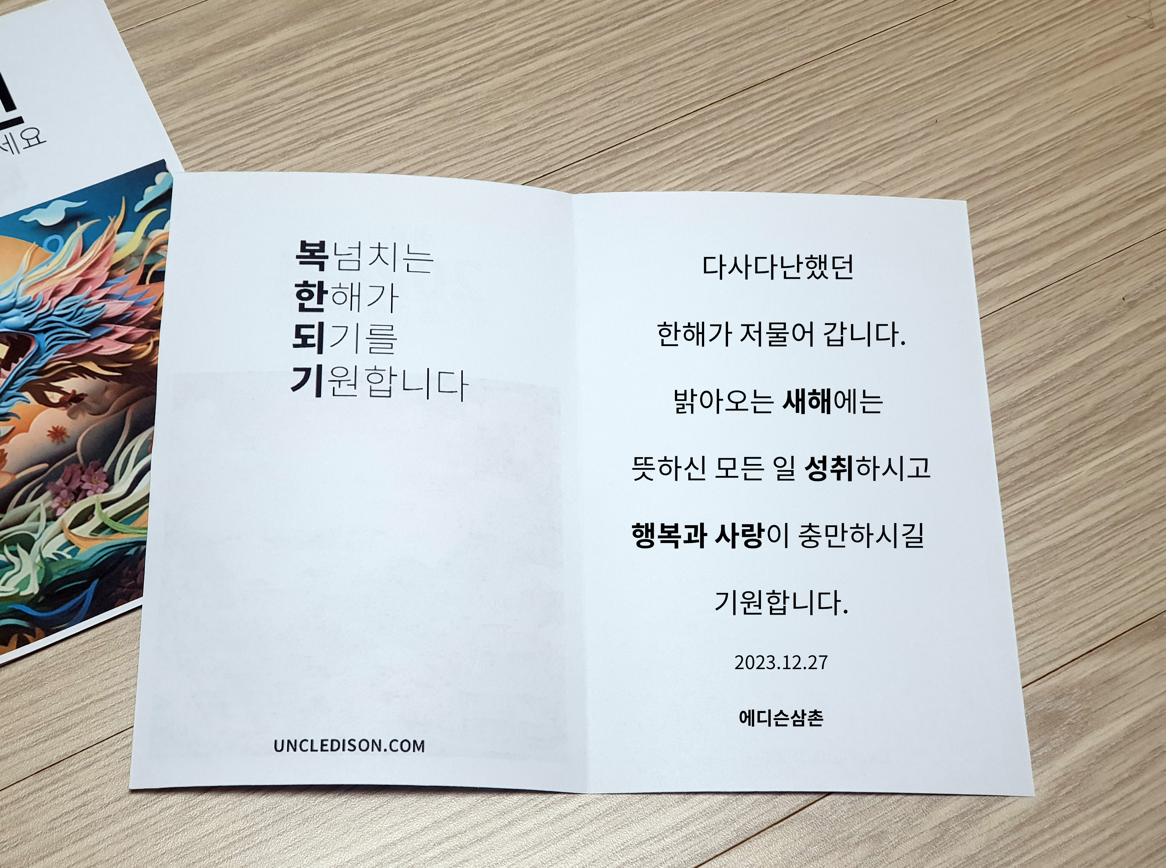 아래 보시는 것처럼 속지의 오른쪽 부분에 연하장 메시지를 작성하시면 됩니다.