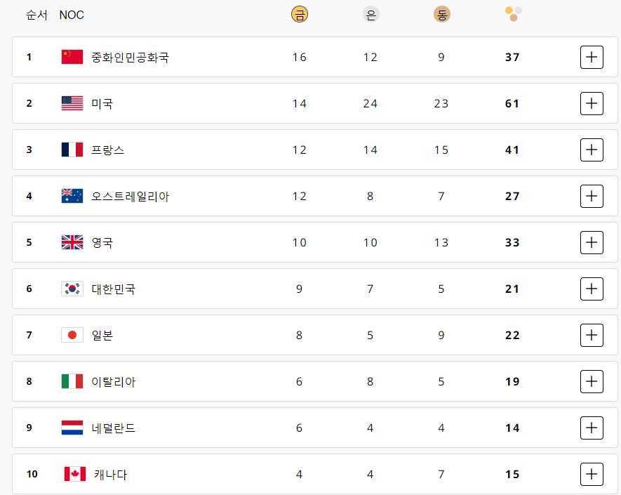 2024 파리올림픽 대회 메달순위